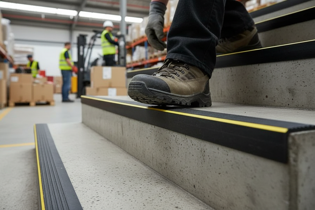 Upgrade your stairs with the 40×40 mm premium non-slip PVC stair nosing with warning strip – a professional safety solution that combines durability, style, and functionality.