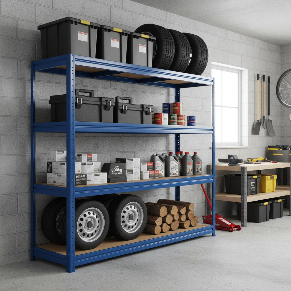 - Industrial grade, heavy duty garage shelving. Each level can hold up to 600kg per level (at 1600mm wide, other widths vary) evenly distributed.