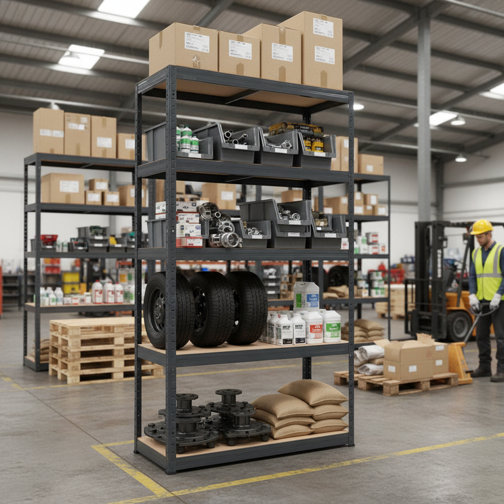 This shelving is designed for indoor use, particularly in garages and stockrooms.