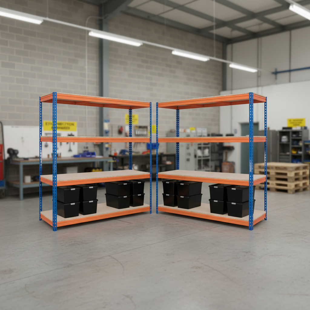 • Four units of our best selling heavy duty shelving with robust plastic storage boxes