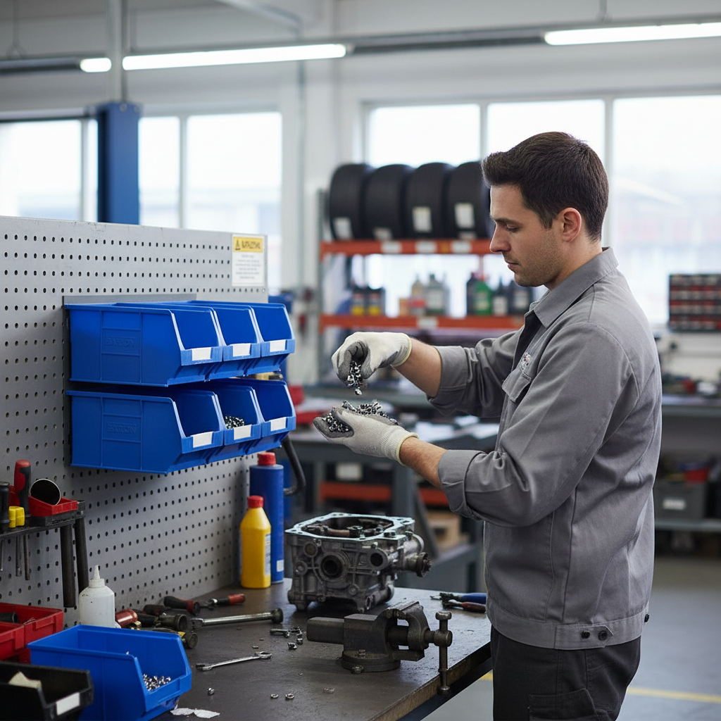 - Grey louvre panel with 6 blue parts bins for organizing small parts