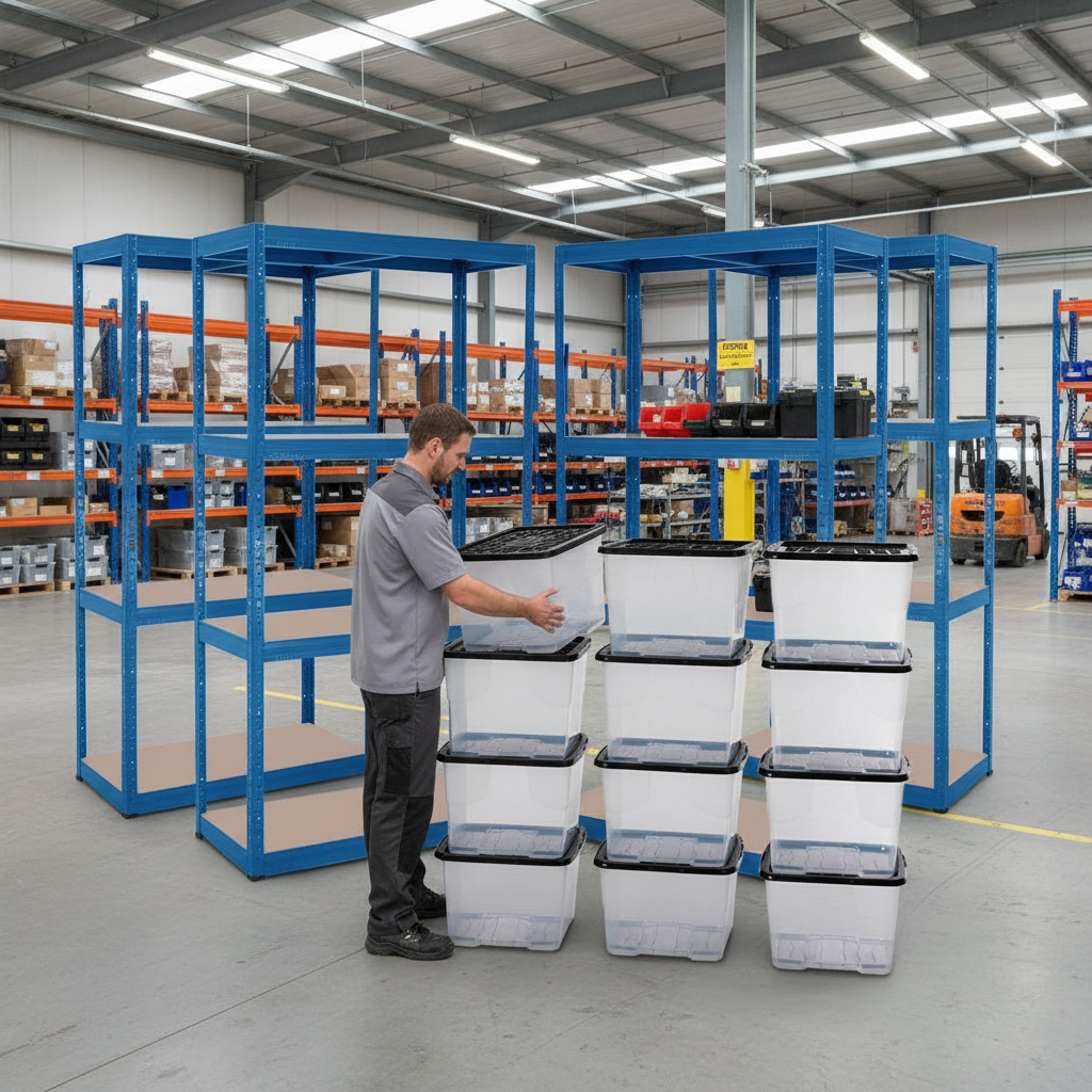 - Our 24L clear plastic storage boxes fit perfectly onto each level to allow you to organise your storage effectively.