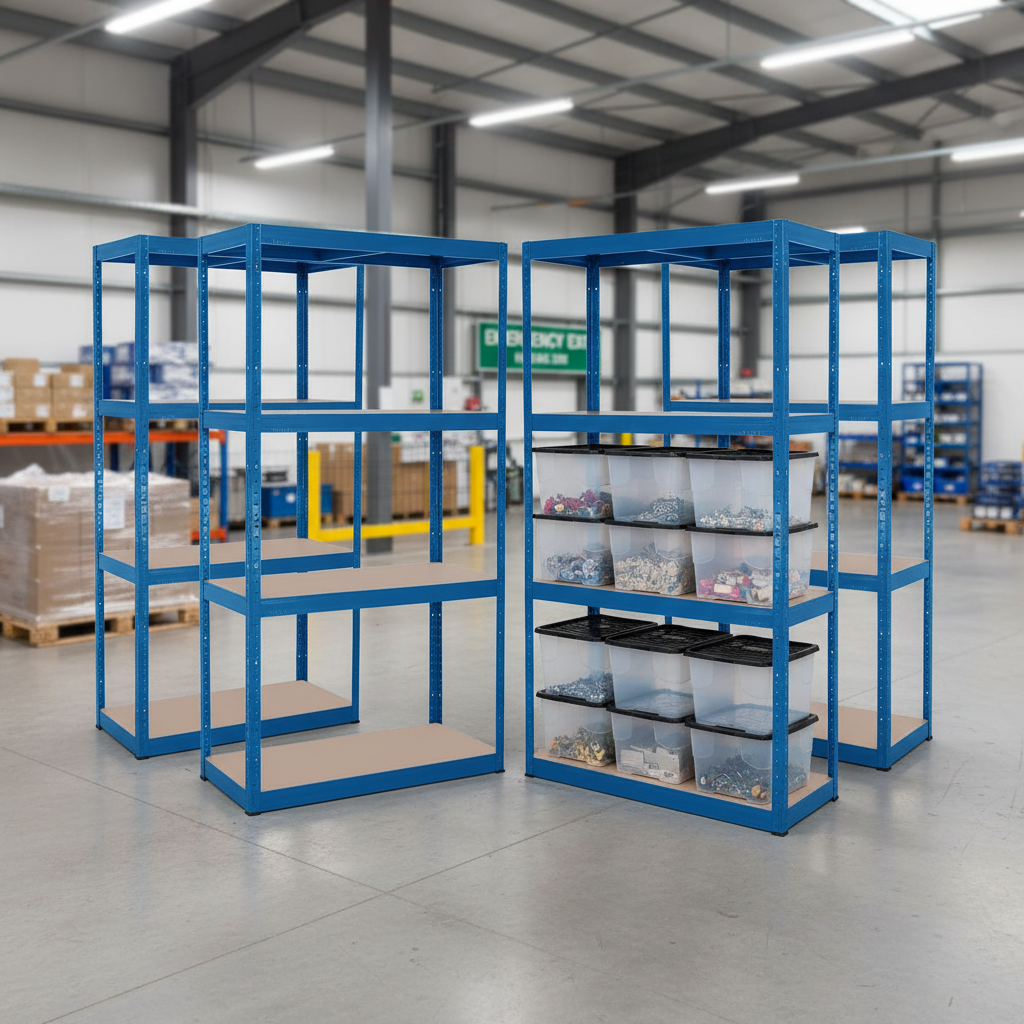 - Heavy duty shelving that's engineered to last with a thick rust resistant blue powder coating.