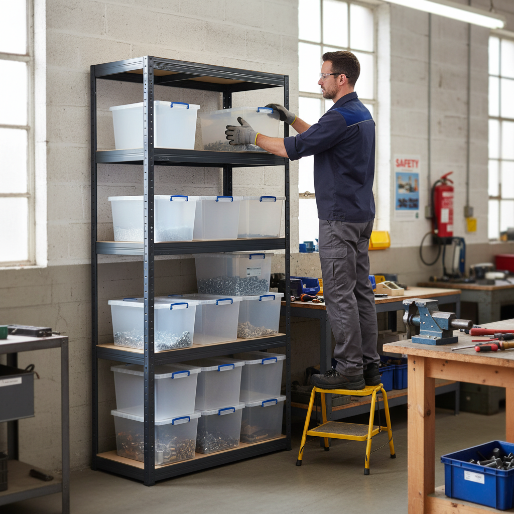 Finally, enjoy an organised and accessible garage or stockroom! This Heavy Duty Shelving Unit is the quick and easy way to clean up and organise your storage space. Thanks to the smart boltless assembly system, the unit will be ready to use in minutes.
