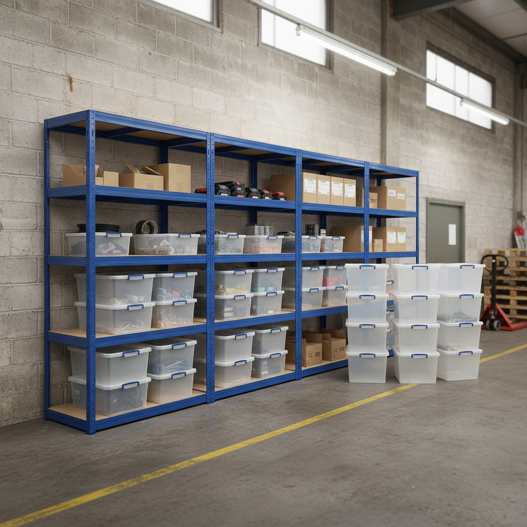 - 3x blue heavy duty shelving units with 12x 33.5L storage boxes