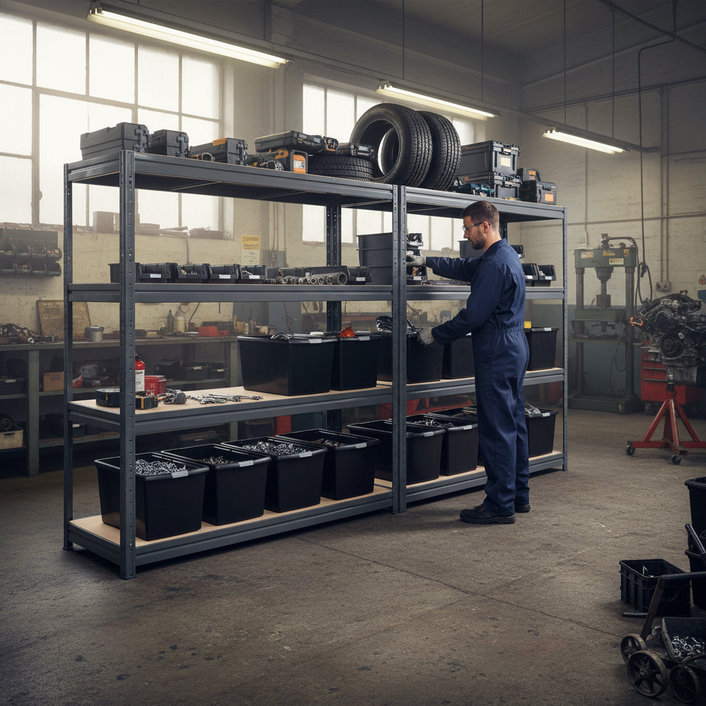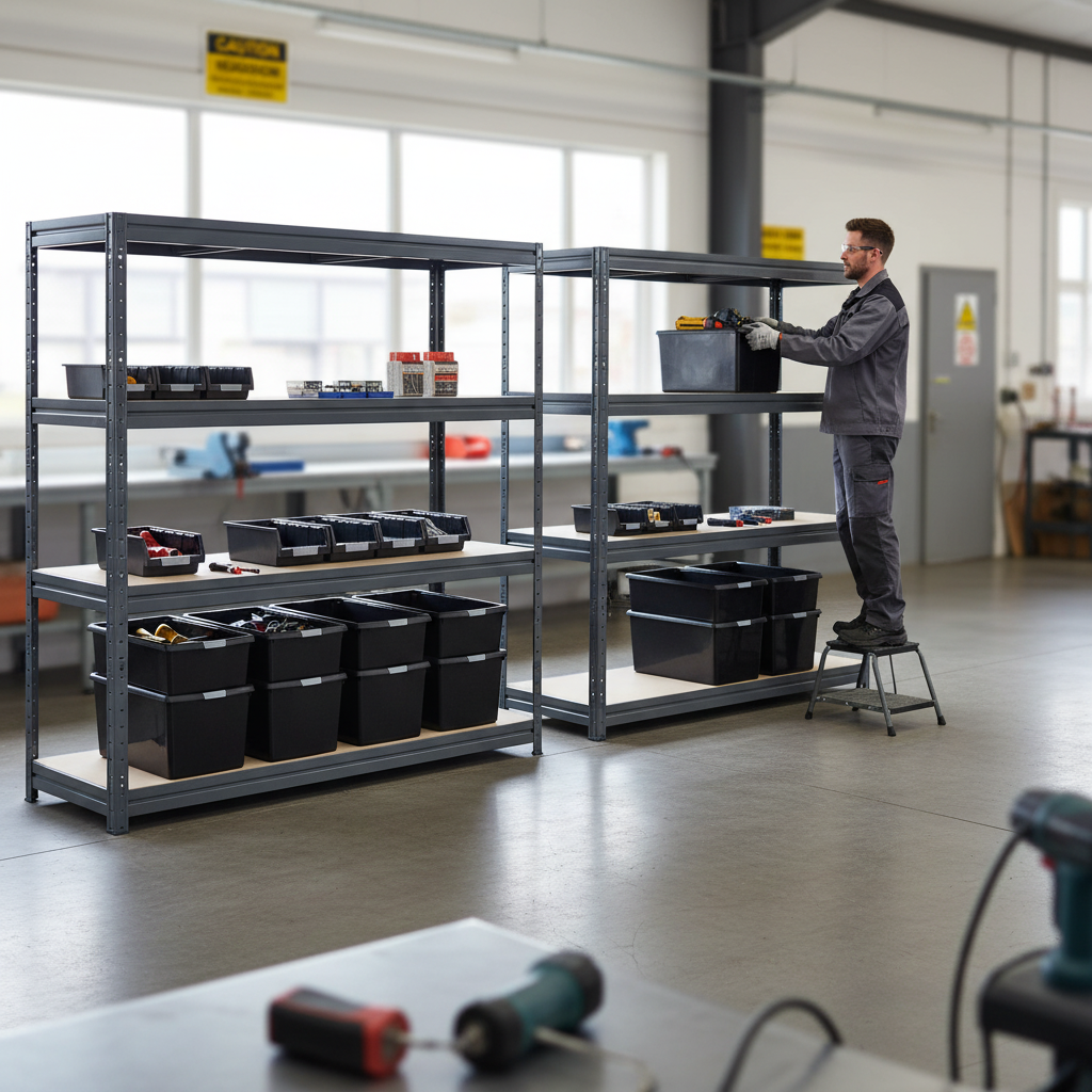 • Two of our industrial grade heavy duty shelving with robust DIY storage boxes.