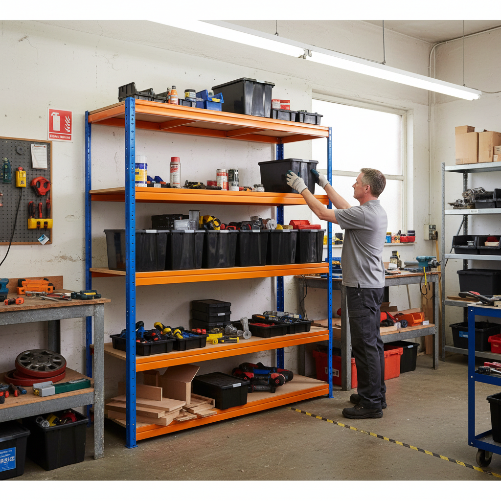 - Industrial grade heavy duty shelving with robust plastic storage boxes.
