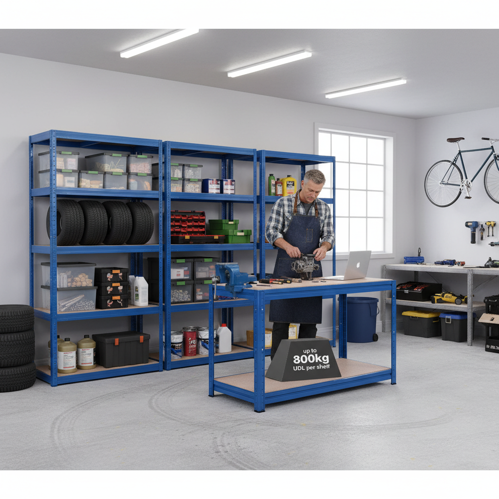 3x Heavy Duty Shelving Units - 1800mm High & 1x Professional Workbench - 1600mm Wide - Blue