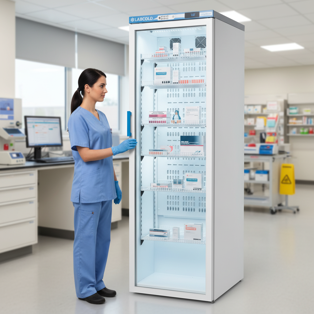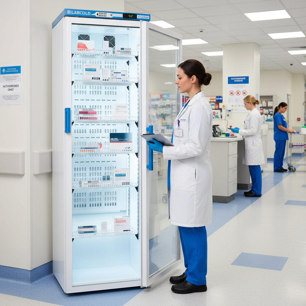 This professional 440 litre pharmacy refrigerator is designed specifically for the safe storage of cold chain medicines, complying with public health guidelines. It features an advanced touch screen controller for easy operation and monitoring.