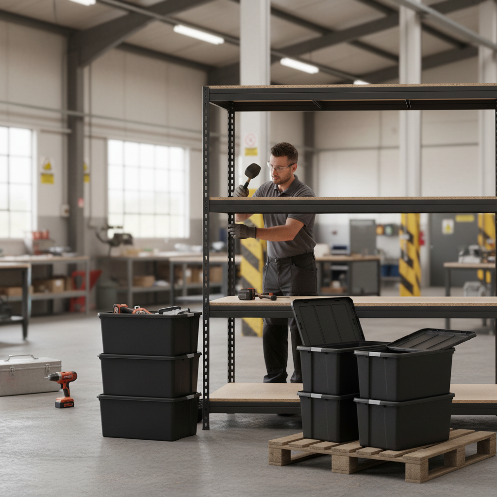- Pack of 4 of our best selling heavy duty shelving units, paired with strong, durable plastic storage boxes.