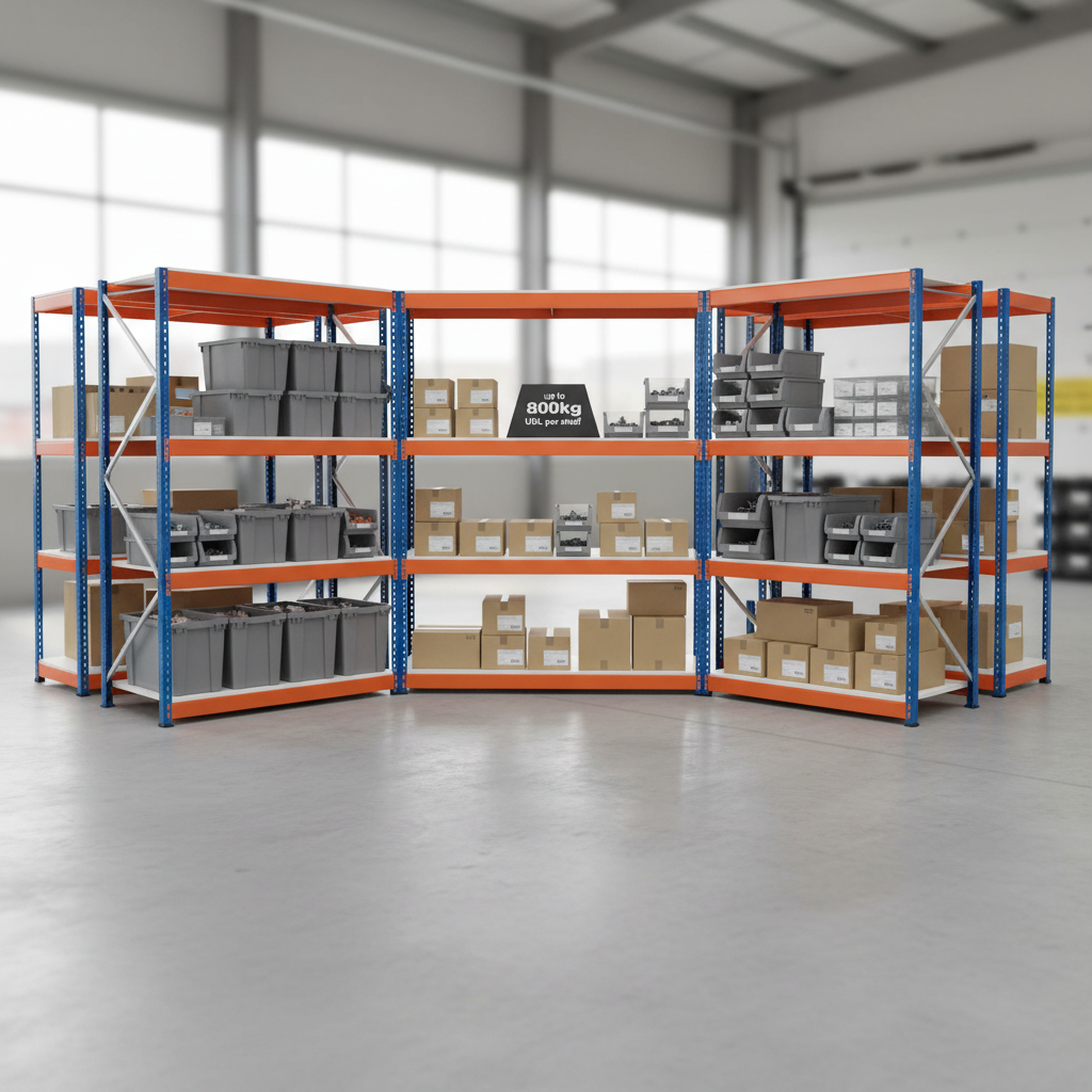 - 15mm thick melamine chipboard shelves, capable of holding up to 800kg UDL per shelf