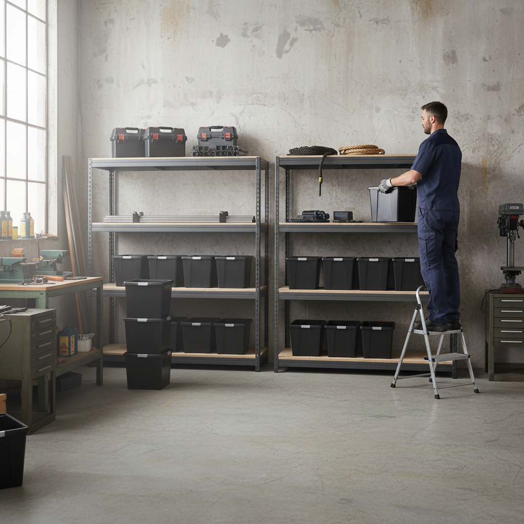 - Four units of premium heavy duty shelving with durable storage boxes