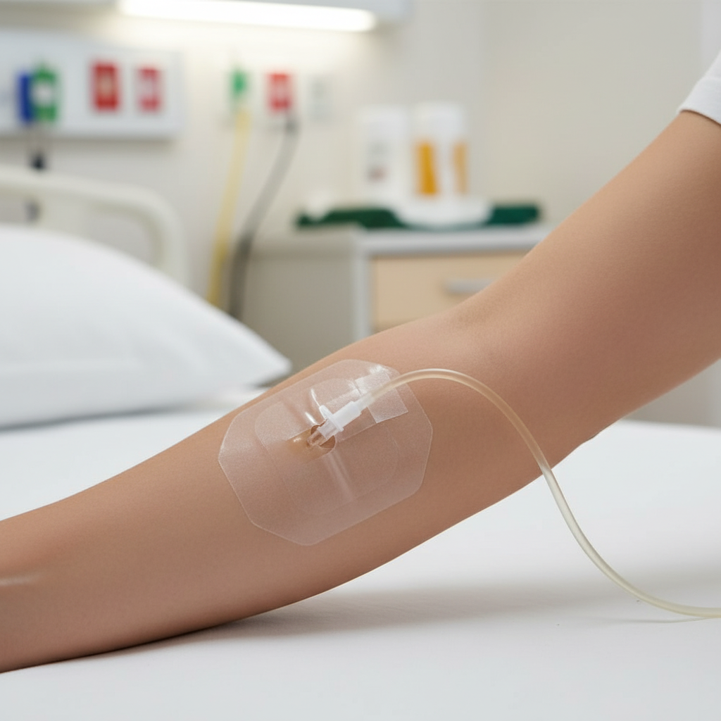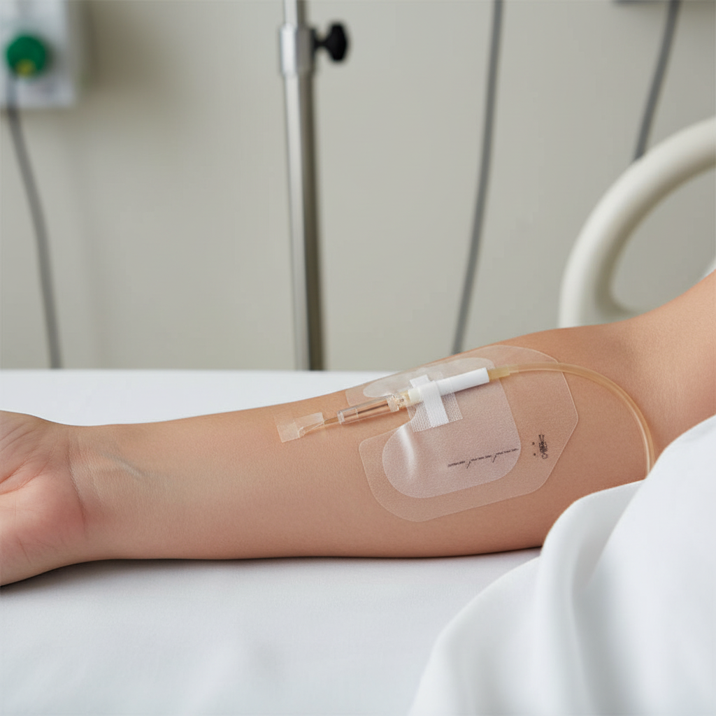 - Transparent dressing for continuous visibility of the I.V. insertion site, facilitating monitoring without removal.