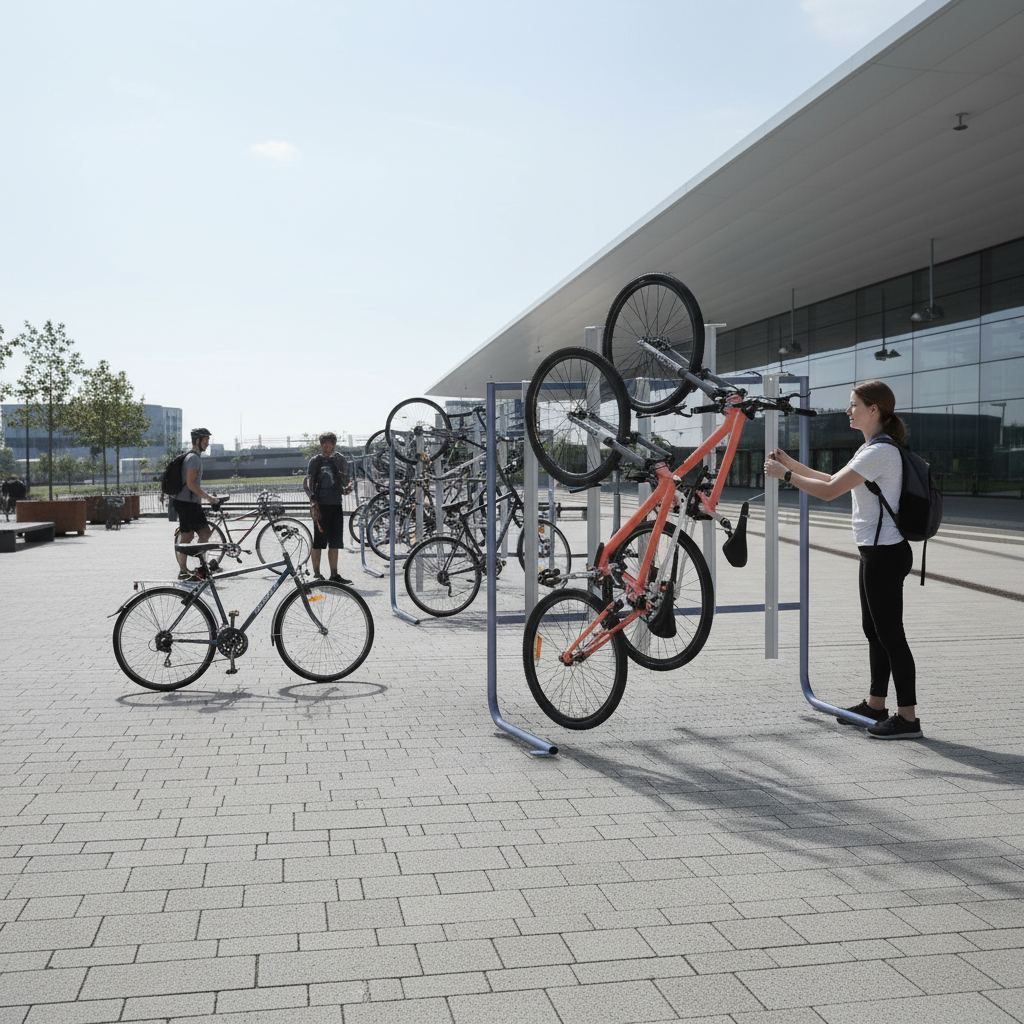 The Premium Slimline Semi Vertical Cycle Racks are the ideal solution for bicycle storage in areas where space is limited. With a depth of only 810mm, these vertical cycle racks provide a high-density parking area while maintaining a small footprint, making them perfect for indoor installations.