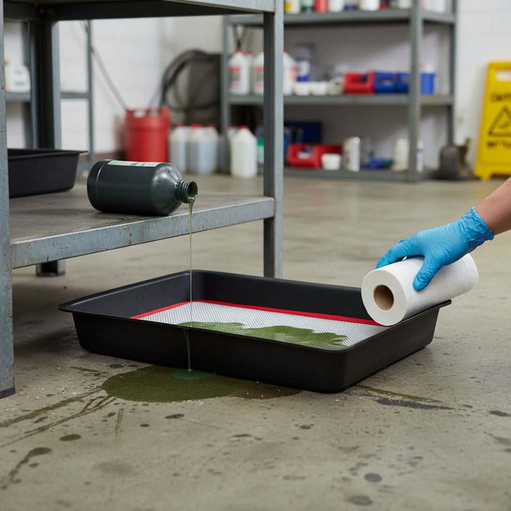 - Pack Contents: 1 Spill Containment Solution, 1 plastic flexi-tray, 1 absorbent mat