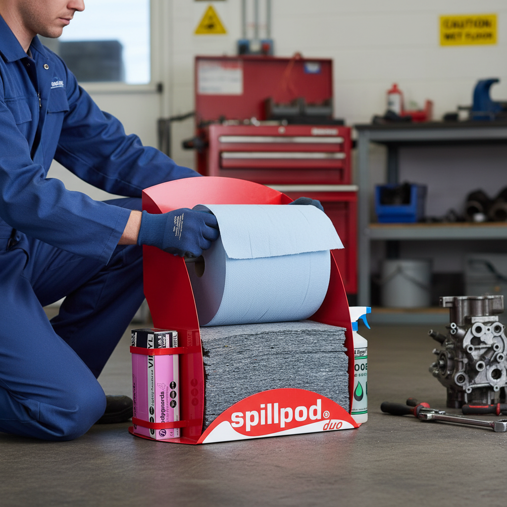 The Premium Spillpod Duo is a self-contained unit designed to centralize your wiping, cleaning, and absorbent needs within a workshop environment. The absorbent pads included are cleaner to use than loose granules and are eight times more absorbent than traditional rags. The perforated paper roll is ideal for general cleaning and wiping tasks. This dispenser unit also conveniently stores disposable gloves and degreaser, ensuring everything you need is at hand. Its high profile design allows for easy identification in busy workspaces.