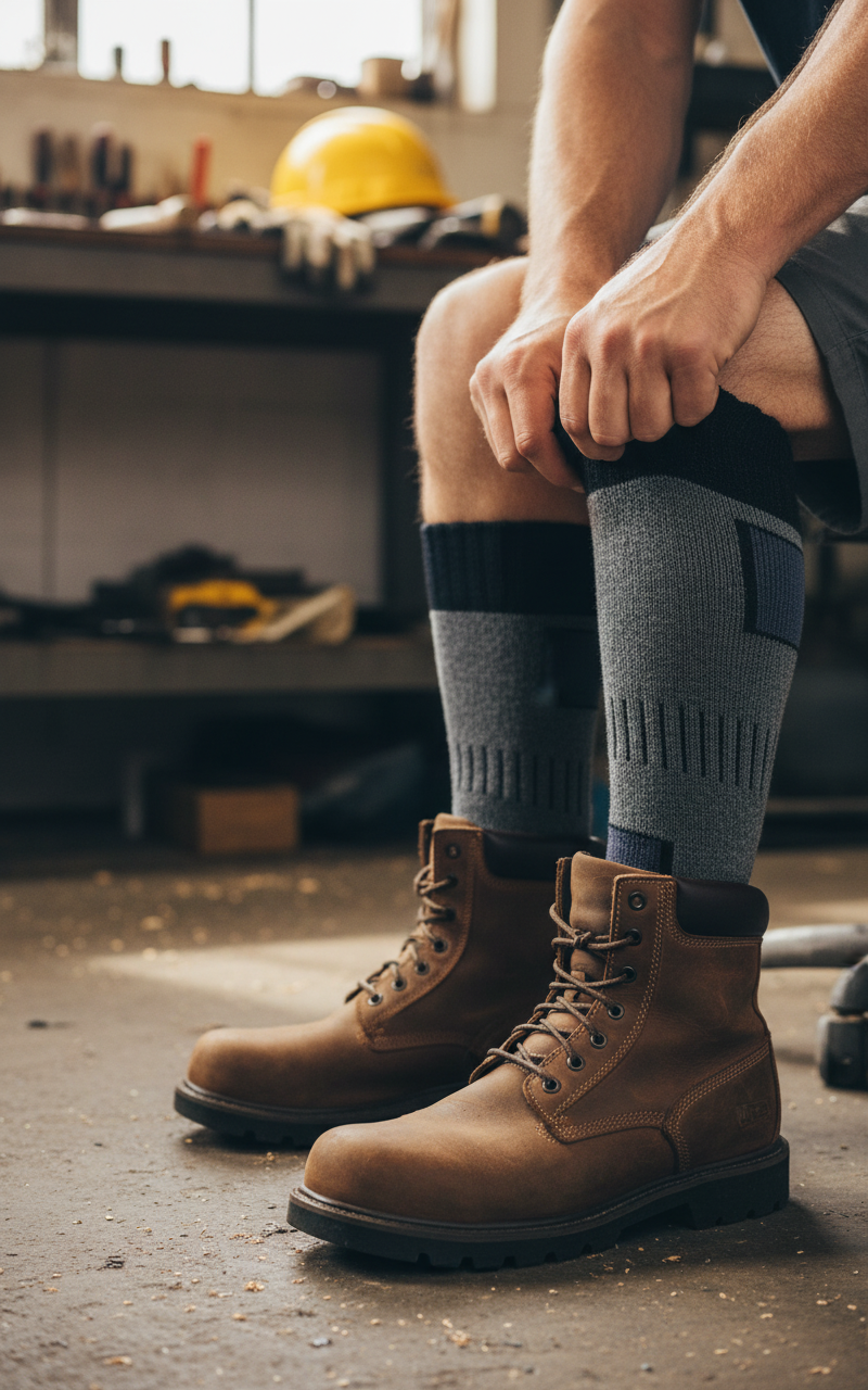 Introducing our Premium Work Boot Socks, designed specifically for comfort and durability in demanding work environments. These socks are perfect for men and are available in a versatile grey color. They provide optimal support and protection for your feet, making them an essential addition to your workwear.