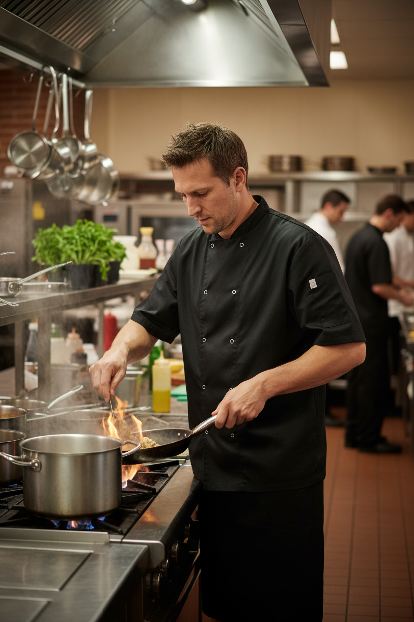 Q: Is this chef's jacket suitable for hot kitchen environments?A: Yes, the breathable fabric blend helps to keep you cool and comfortable even in high-temperature kitchen conditions.