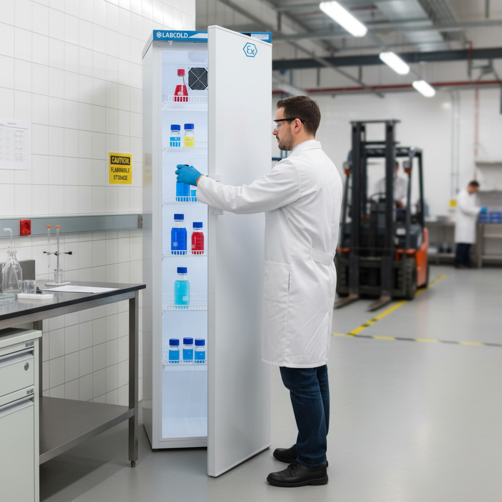 This 439 litre capacity sparkfree refrigerator is designed for safety and compliance in hazardous areas, certified under the ATEX Directive 2014/34/EU. It is suitable for storing products classified in explosion group IIB+H2 and temperature class T6.